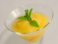 Ingredientes: 3 mangos, 150 gramos de azúcar, el zumo de un limón, 125 mililtros de agua, unas hojas de menta (hierbabuena) para decorar.